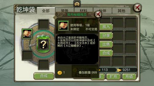 使命奖赏也是相当丰盛,百年菩提子、2级五行石、3级同伴升星丹包括宝贵秘籍残页都有可能收入囊中。使命所给的秘籍残页能够在【乾坤袋】中组成《无用闲书》。