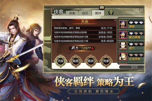 當結交值到達必定數值後可提高結交等級,並添加俠客特點。當俠客結交數量及等級到達糾纏陣法要求時,耗費【鬼谷秘錄】可激活糾纏,獲得特點加成。