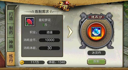 首先点击头像,炼丹体系在【制造】界面,炼制需耗费【曼陀罗花】、金币和体能,珍贵的曼陀罗花需经过少室山及护卫雁门关任务获取,完结日常任务添加活跃度,也能获取【曼陀罗花】。