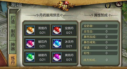 炼丹体系与少侠们的日常生长密不可分,是各位提高战力的灵丹妙药。但傲视天地吞噬苍穹,除了具备精湛的技艺方法之外,炼丹之功也需求各位莫要急于求成,唯有脚踏实地悉心锻炼才是成为问鼎中原武林的光亮之道!