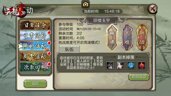 變身後的boss更加強力,全新的跨服副本"瓊樓玉宇"作為《天龍3D》新材料片中的壹大亮點,玩法形式也與之前的副本略有不同,除了跨服匹配的機制。
