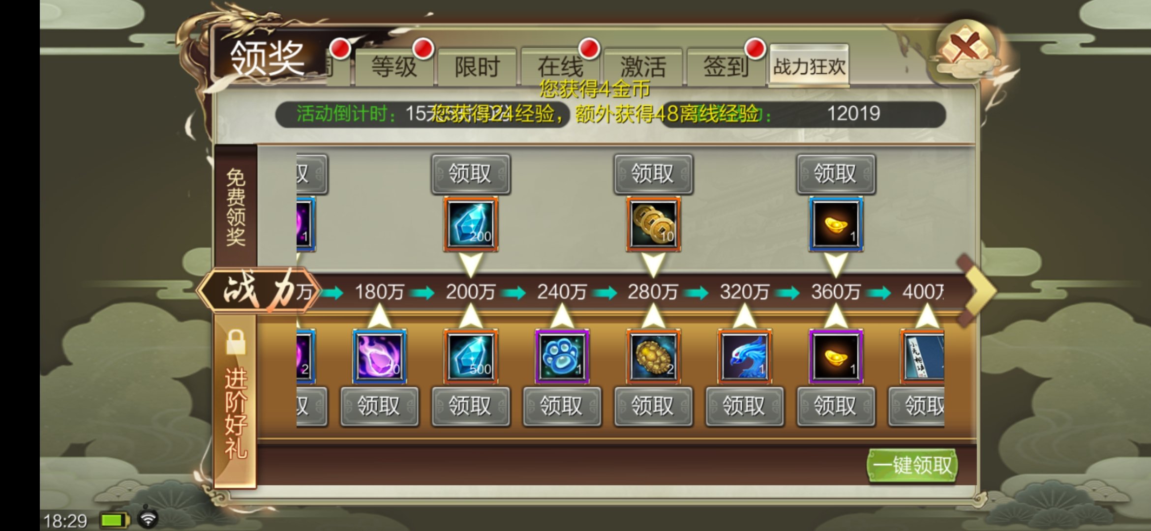 少侠可收取炫彩称谓“春风不如你”,女侠可收取炫彩称谓“桃花不及卿”,动动手指即可具有侠士到达指定战力即可收取免费奖赏!玉辉石、占卜铜钱。