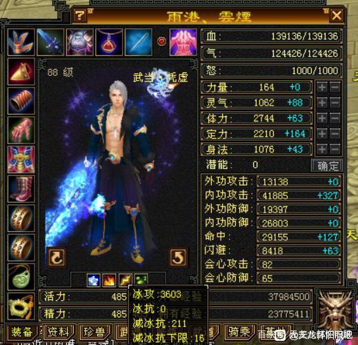 第一位气武当,血量近14万,蓝量12.4万,内功进犯4.1万,射中2.9万,闪避8418,冰进犯3603。