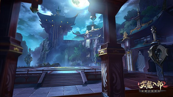 假如沒有提前告知你,很難信任這是來自一款手遊的實景截圖。劍湖宮深陷皎潔的月光下,盡顯質感。遠近盤繞雲山之間,仿佛置身於無量山中,等待著恩怨情仇的來臨。