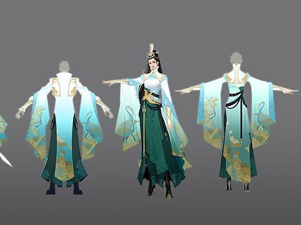 入門弟子首先要閱歷照己、觀心、悟道三重歷練,追求道法六合的境界。而入室弟子的考驗則愈加嚴苛,不僅要在武學修為上拔得頭籌,更要有兼濟天下的純善之心。 時裝整體環繞蒼松與靈鶴主題規劃,立體式裁剪更具有道家神韻。青白交錯的長袍製作長青松針紋,既彰顯武當派不入塵囂的清雅與空靈,也傑出入室弟子堅定不移、遵循道心的心境。 雙袖以金線縫製靈鶴蒼松紋理,又添一分超然脫俗的道家風骨。下裝海青色長衫與上衣形成撞色美感,似乎地脈清氣噴薄而出,儼然一片道法天然的和諧盛景。